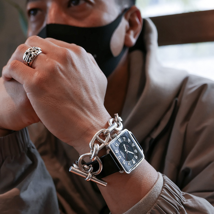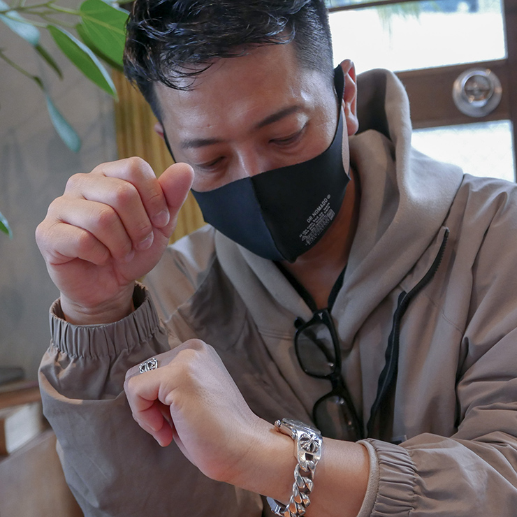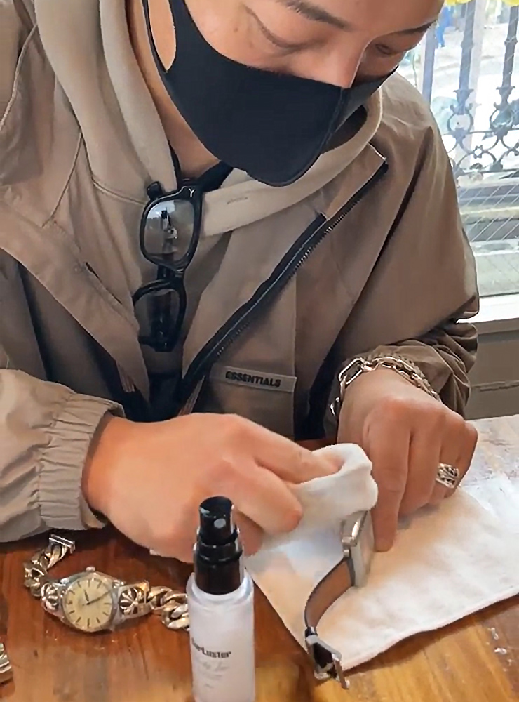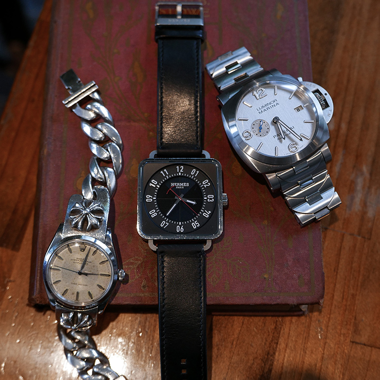 今メインで使っている時計はこの3本で、今日着けているのはエルメスのカレ。角型で、あまり人と被らないのが気に入っていて、ややモードな感じのスタイルのときに着けてます。僕は基本的に時計とアクセサリーを重ね着けするんですが、これは同じくエルメスのシェーヌダンクルと合わせてますね。こっちのロレックスは、自分のアニバーサリーイヤーに購入したもので、僕の中のマスターピースですね。初期のエクスプローラーで、当時だからこそオーダーできたクロムハーツの特注ブレスレットに付けてます。これは少しエッジのきいた、ストリート調のコーディネートに合わせているかな。ピュリファイタイムは、このエクスプローラーのよううなブレスレットタイプの時計に良いですね。特殊なブレスレットっていうのもありますが、これまであったシルバー磨きのような研磨剤入りのクリーナーだとエッジが削れていっちゃいますからね。それだと時計には使えないなと。時計用でこういうクリーナーはなかったので、使いやすそうです。