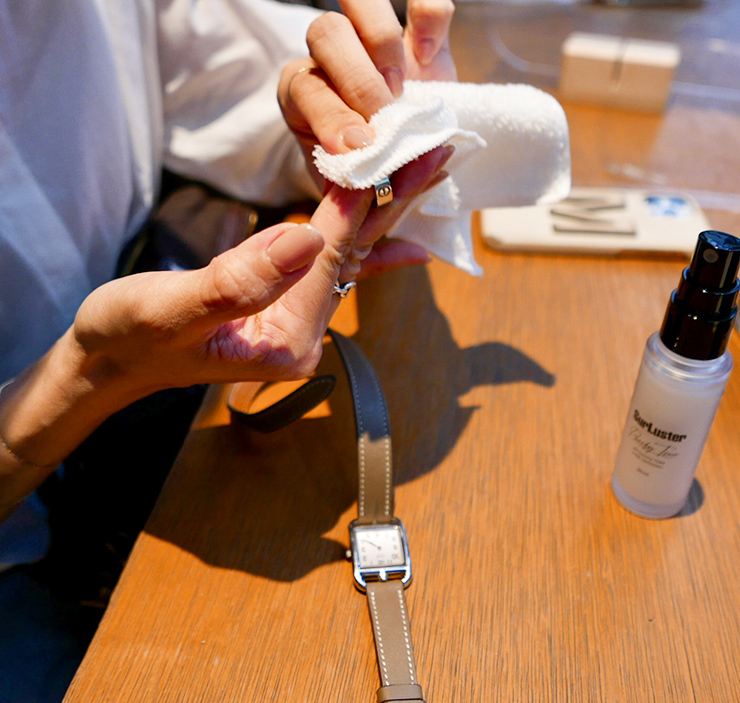 あっ、リングを拭いてみたら、ダイヤの表面もうっすら汚れていたみたいで輝き方が全然変わりました! キラキラ感がでてきた〜。(当日つけていたリングを続々と拭き始める村田さん)特に、太さのあるリングは違いがわかりやすいですね。絶対、みんなこれやった方がいい、だってすごく簡単なんです。しかも、時計だけじゃなくてジュエリーはもちろん、例えばサングラスとかに使っても大丈夫そう。レンズとかも汚れるじゃないですか。1つで色々お手入れできちゃうのはポイント高いですね。夏場にはより活躍しそう。
