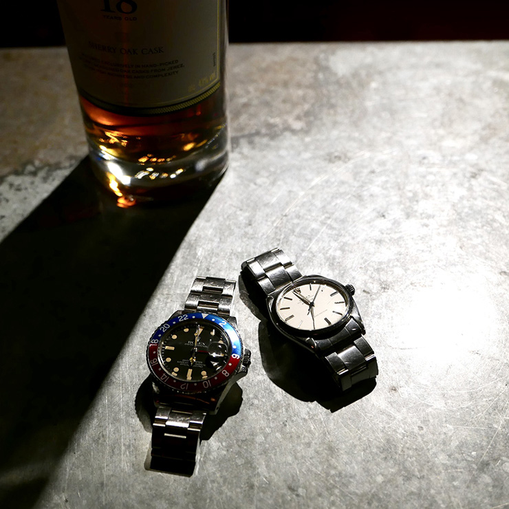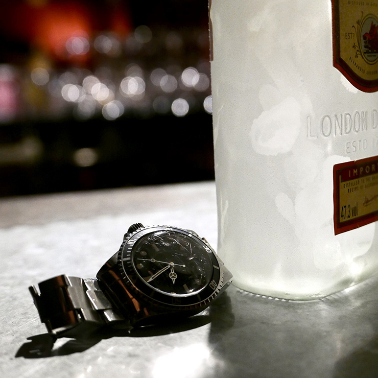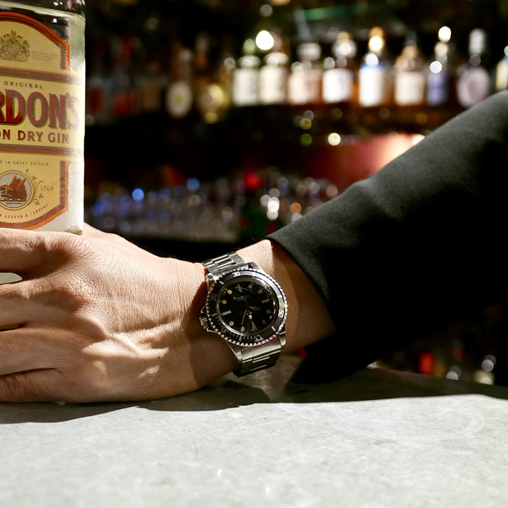 あるときに、今ではもう作ってないものの価値が凄まじいということに気づいたからですね。仕事柄、ウィスキーやジンは日々仕入れて消費していくわけなんですが、昔はマッカランとか山崎とか今やプレミア化しているものも普通に数千円で買えましたからね。しかも味が今よりいい。人の手が入っていることが感じられて、深みがあるというか。製造に機械が導入されてオートメーション化されたあとの均質化されたお酒とはやっぱり味わいが違うんですね。バーテンダーって、普通はお酒単体の味をそこまで見ないんです。それは、シェイクしてカクテルにしてお出しするのが前提だからなのですが、僕は割とそういう個別のお酒をチェックするのが好きで。いいお酒はラベルが切り替わったりするときに製法も変わったのかな?とか、アルコール度数が変わったりすると味が変わることに気づくようになり、質が落ちていたら前の世代のものを思い切って大量に買っています(笑)。ギムレットっていう有名なカクテルがあるんですけど、これはゴードンっていうジンで作るのが絶対においしいって思ってますが、昔のゴードンがやっぱり素晴らしいんです。すみません、時計の話からは逸れましたが(笑)、時計も現行よりヴィンテージがいいのは同じような理由ですね。
