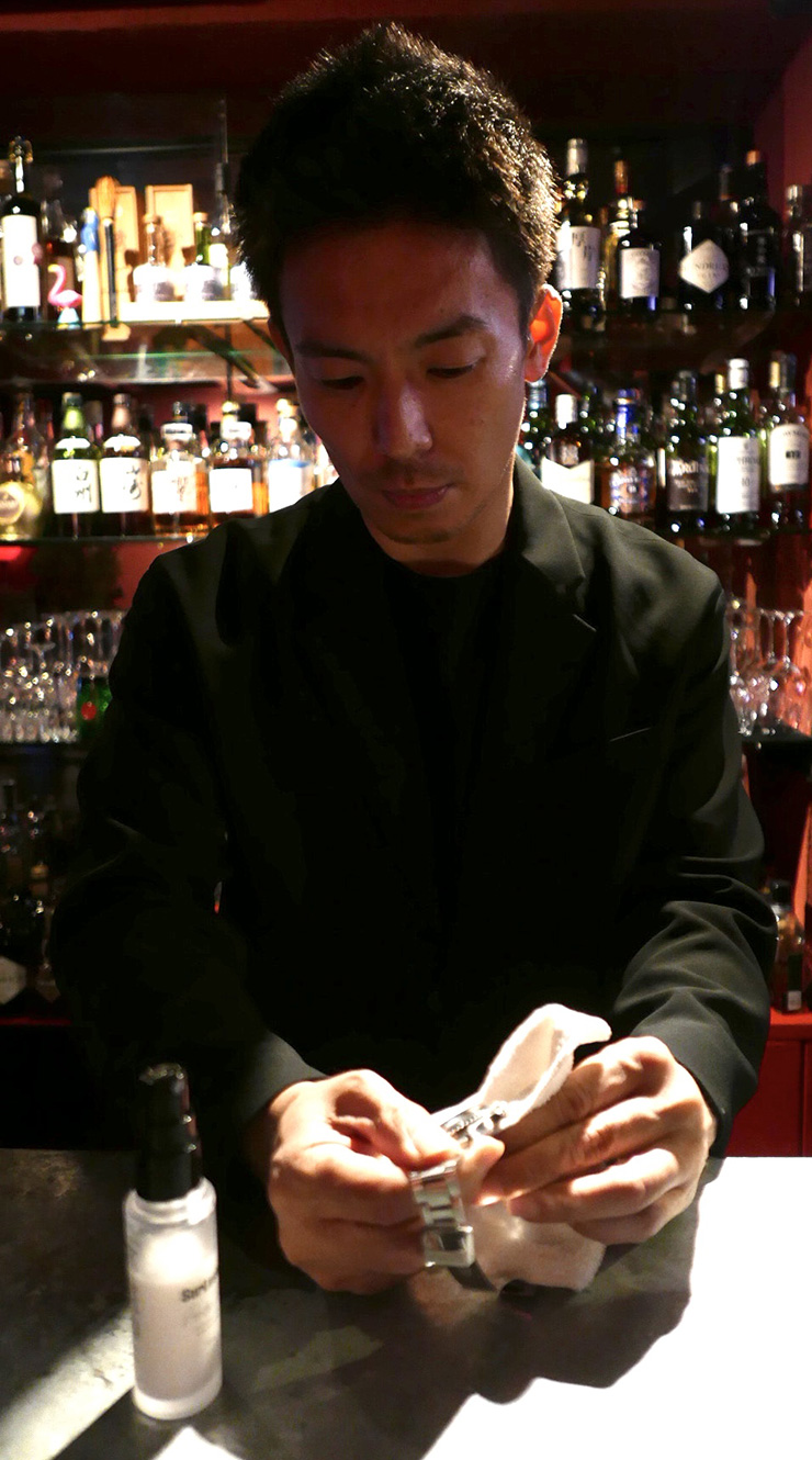 六本木でBAR「BOOZER」を経営するバーテンダーの北風さんは、収集価値のあるものへの目利きでそのジャンルは多岐にわたる。近頃盛り上がりを見せているジャパニーズウィスキーはもちろん、多種多様なお酒、デニム、時計に関しても買い時に敏感だ。20年以上続く時計趣味だが、手入れには関心がなかった北風さんにピュリファイタイムを試してもらった。